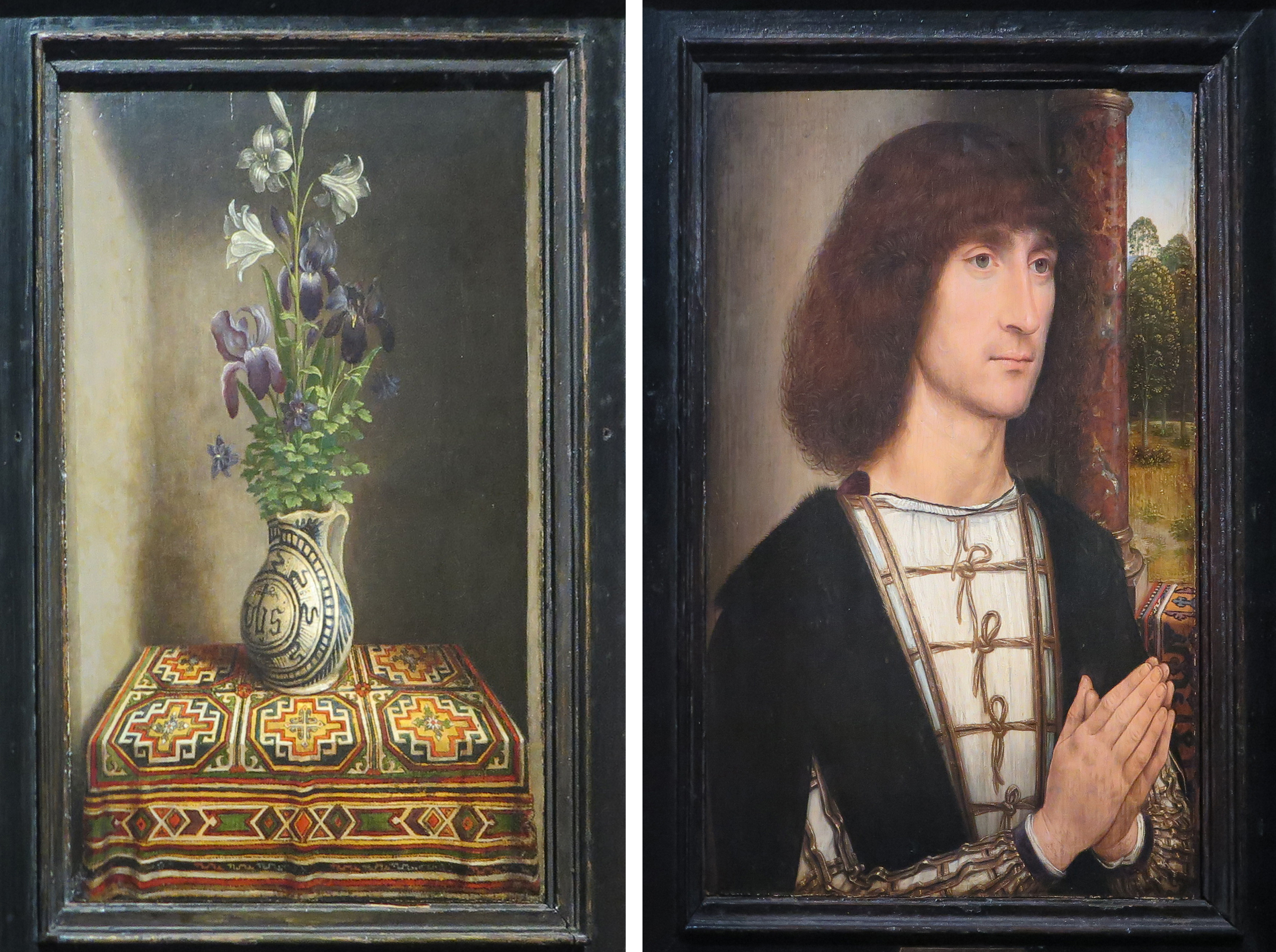 Memling, Voor en achterkant van een paneel met een vaas met bloemen in een nis en een portret van een biddende man, ca. 1485